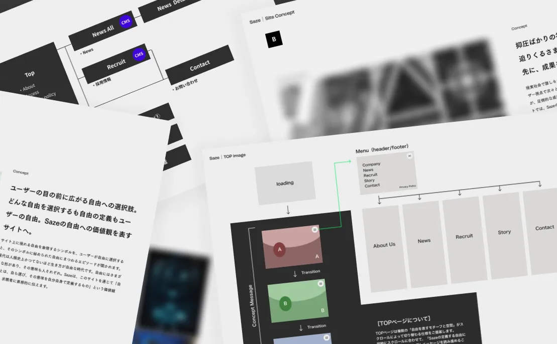 私たちは、この挑戦的なプロジェクトを実現するため、クリエイティブパートナー「株式会社セルインタラクティブ」と、最初の数ヶ月はサイト全体のコンセプトとデザインの方向性を模索していきました。既存の枠にとらわれない表現を追求する中で、「どんな自由を選択するも、自由の定義もユーザーの自由。」というコンセプトアイデアが生まれました。サイトにさまざまな自由を表すモチーフが現れ、スクロールと連動しながら、「自由とは、自ら選び、その意味も自分自身で定義するもの」というSazeの価値観をCGを用いてユーザーに体験させるサイトにしよう、と決定しました。このCGを核としたコンセプトメイキングには、2〜3ヶ月もの時間を費やしました。対面で何度も制作パートナーと顔を合わせての打ち合わせを実施し、度重なる議論と試行錯誤の末、「鍵」「翼」「扉」という3つのモチーフが生まれました。